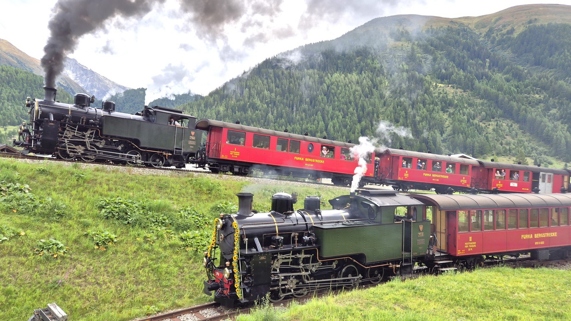 Zwei Vierkuppler auf der Furka Bergstrecke. Foto DFB Gian David Fluri