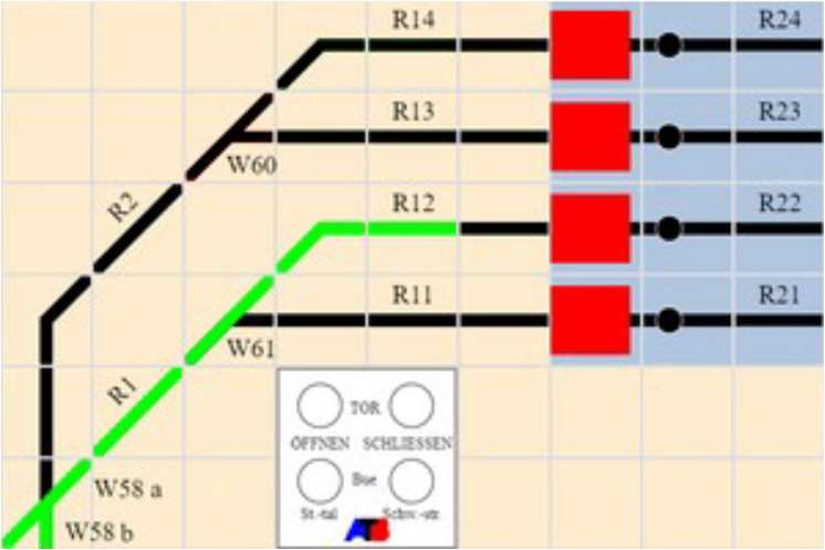 Die Remisengleise sind mit R21 bis R24 bezeichnet.